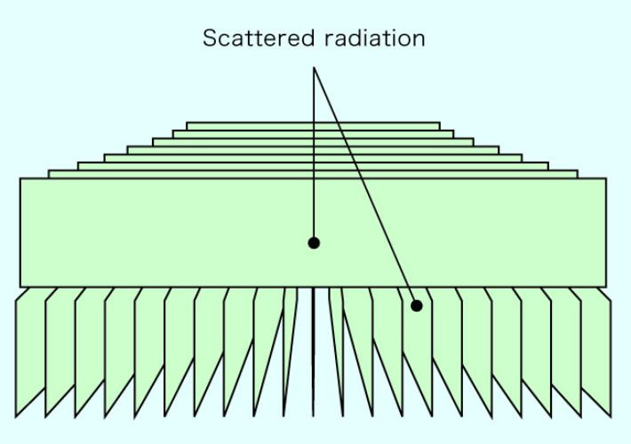 When the primary radiation passes through a subject during X-ray imaging, scatter radiation is inevitably produced, caused by various substances in the subject. When scatter radiation reaches the film, it sensitizes even areas which should not be sensitized. This produces radiographic fog on the film and lessens contrast, which degrades the diagnostic quality of the X-ray. A grid, the formal name of which is Anti-Scatter Grid, acts as a filter, effectively removing scatter radiation before it reaches the film.